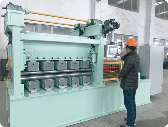 本機床是四重式校平機的升級機型。在上、下排校平工作輥與支撐輥(輪)之間各加裝進一排中間輥,構成上下各三重,共六重的組輥結構。通過中間輥的過渡,支撐輥(輪)的支撐力不直接作用于工作輥,避免了四重式校平機工作時,在敏感材料表面留下支撐輥(輪)壓痕的現象,最大程度地保護加工材料的表面狀態。主要用于校平鋁板、不銹鋼板、銅板、有色金屬板、不同金屬復合板,涂、鍍、磨工藝金屬板等對板表面要求較高的板材。校平輥受力分布均勻,結構剛性好,工作輥繞曲變形小,校平精度高。